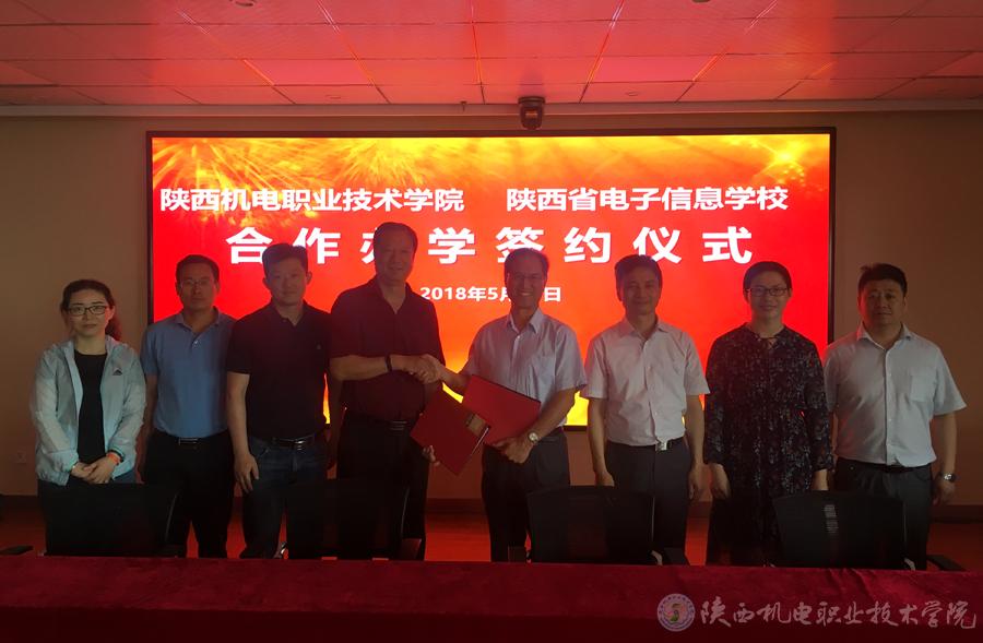 2018年5月31日,学院与陕西省电子信息学校举行中高职集团化办学签约仪式。学院党委书记、院长伊逊智,副院长张新堂、副院长张琴等出席签约仪式。陕西省电子信息学校副校长梁文华及机电专业科主任郭江华、电子专业科主任冯露等一行参观学院并出席签约仪式。