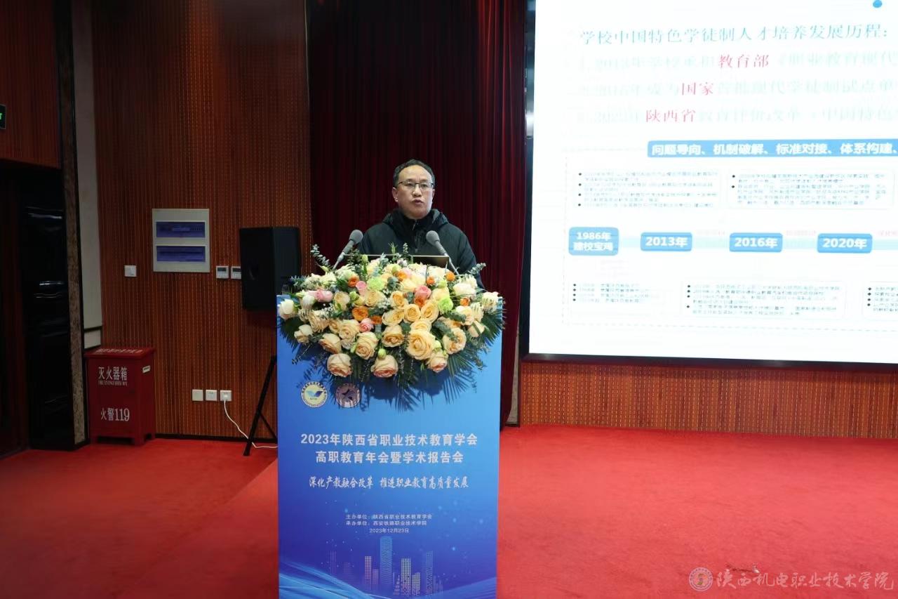 12月23日,陕西省职教学会2023年高职教育年会暨学术年会在西安召开,本次会议由陕西省职教学会主办,西安铁路职业技术学院承办。陕西省委教育工委委员、省教育厅副厅长申雪峰、职成教处处长王鹏,陕西省职业技术教育学会会长崔岩、全国高等职业学校校长联席会议主席、天津职业大学原校长董刚教授及相关会员单位代表等200余人参会。我校党委副书记、院长向纪明,党委委员、副院长张克及教务处、各二级学院负责人参加会议。