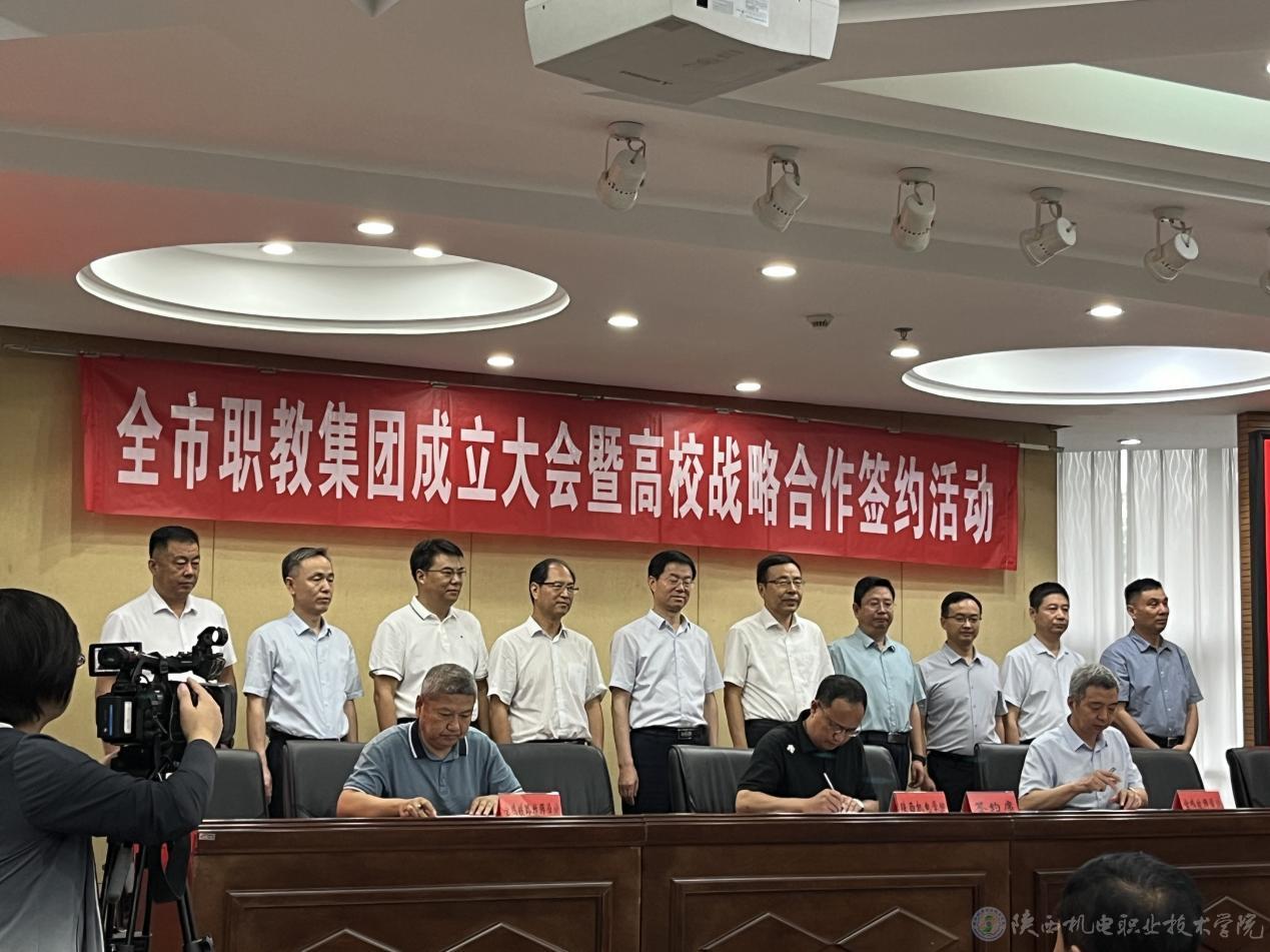 向纪明与金台区职业教育中心、凤翔区职业教育中心、岐山县职业技术教育中心、扶风县职业教育中心、麟游县职业教育中心、宝鸡技师学院、宝鸡铁路技师学院7所院校负责人共同签订陕西机电职业技术学院教育集团战略合作协议。
