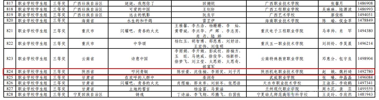 近日,由教育部、国家语委主办,教育部语言文字应用管理司负责实施的全国性赛事活动——第六届中华经典诵写讲大赛评审结果揭晓。陕西机电职业技术学院基础部(体育部)教师赵娥、魏籽琦指导的作品《叩问青铜》荣获全国“诵读中国”经典诵读大赛三等奖。