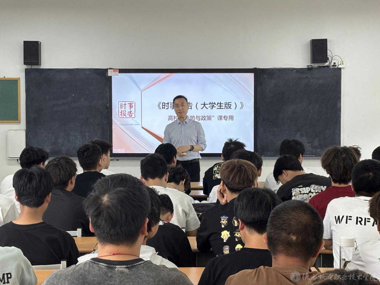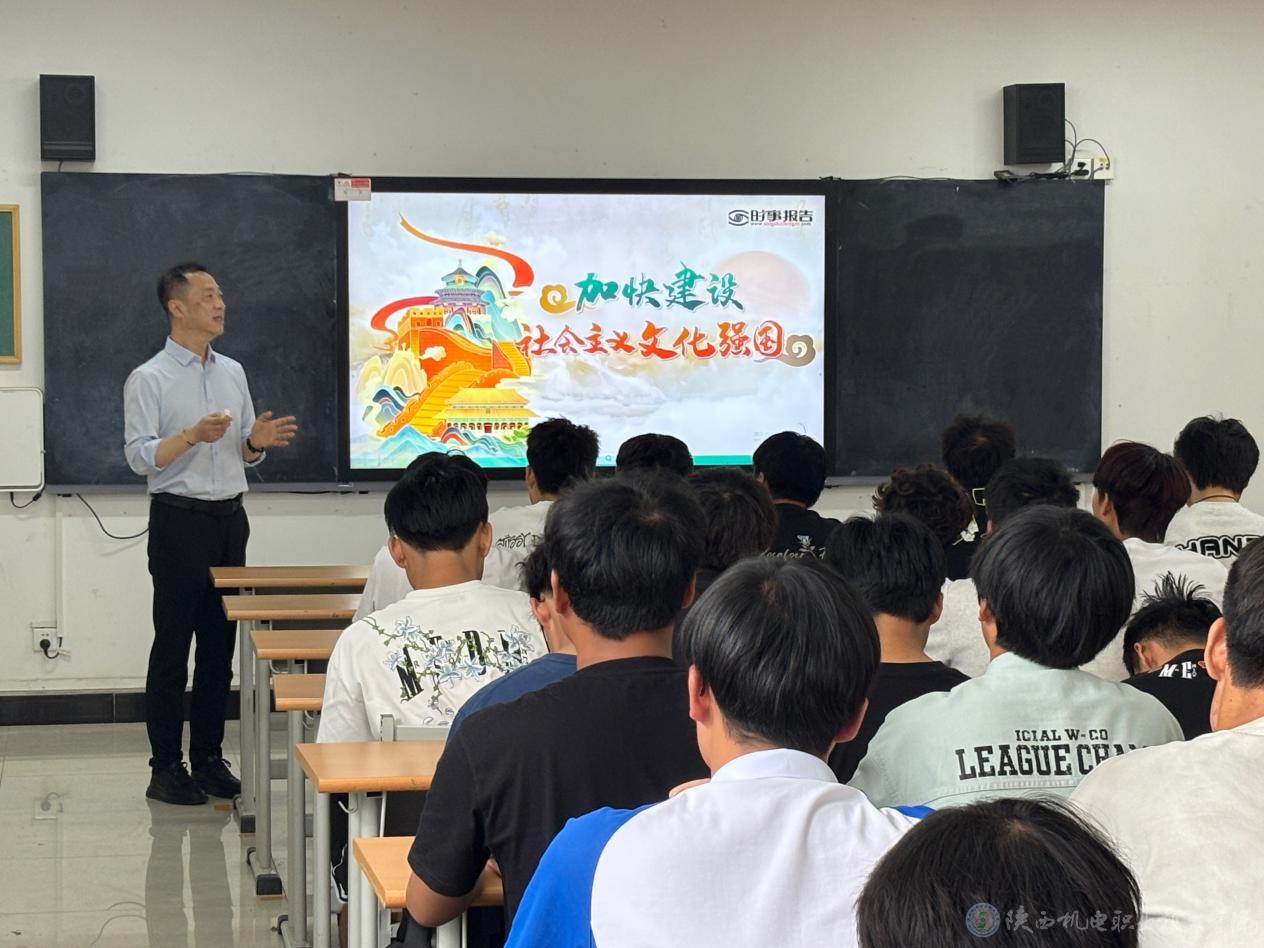 5月27日下午,陕西机电职业技术学院党委委员、副院长张克在蟠龙校区博学楼315教室为24机电技术5、6合班学生讲授形势与政策课《加快建设社会主义文化强国》专题内容。