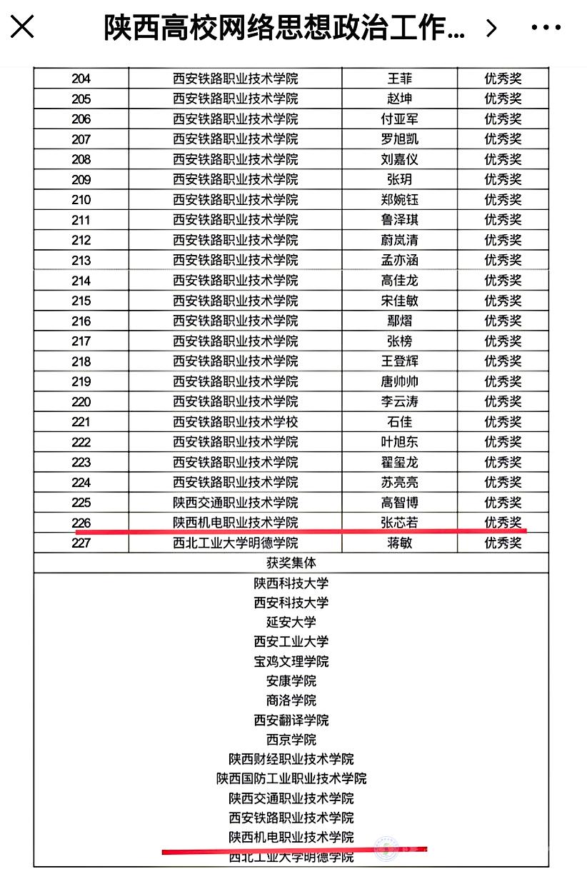 陕西高校网络思想政治工作中心、陕西省高校易班发展中心发布《陕西高校大学生新型冠状病毒肺炎疫情防控网络知识竞赛获奖名单的公告》,公布本次知识竞赛优秀组织奖名单和个人获奖名单,其中全省高校优秀组织奖15个(其中高职类院校5个),高校个人奖227个(其中高职类院校56个)。我校师生在本次知识竞赛中表现出色,喜获“优秀组织奖”,我院16动漫五年班张芯若同学获得“优秀奖”。